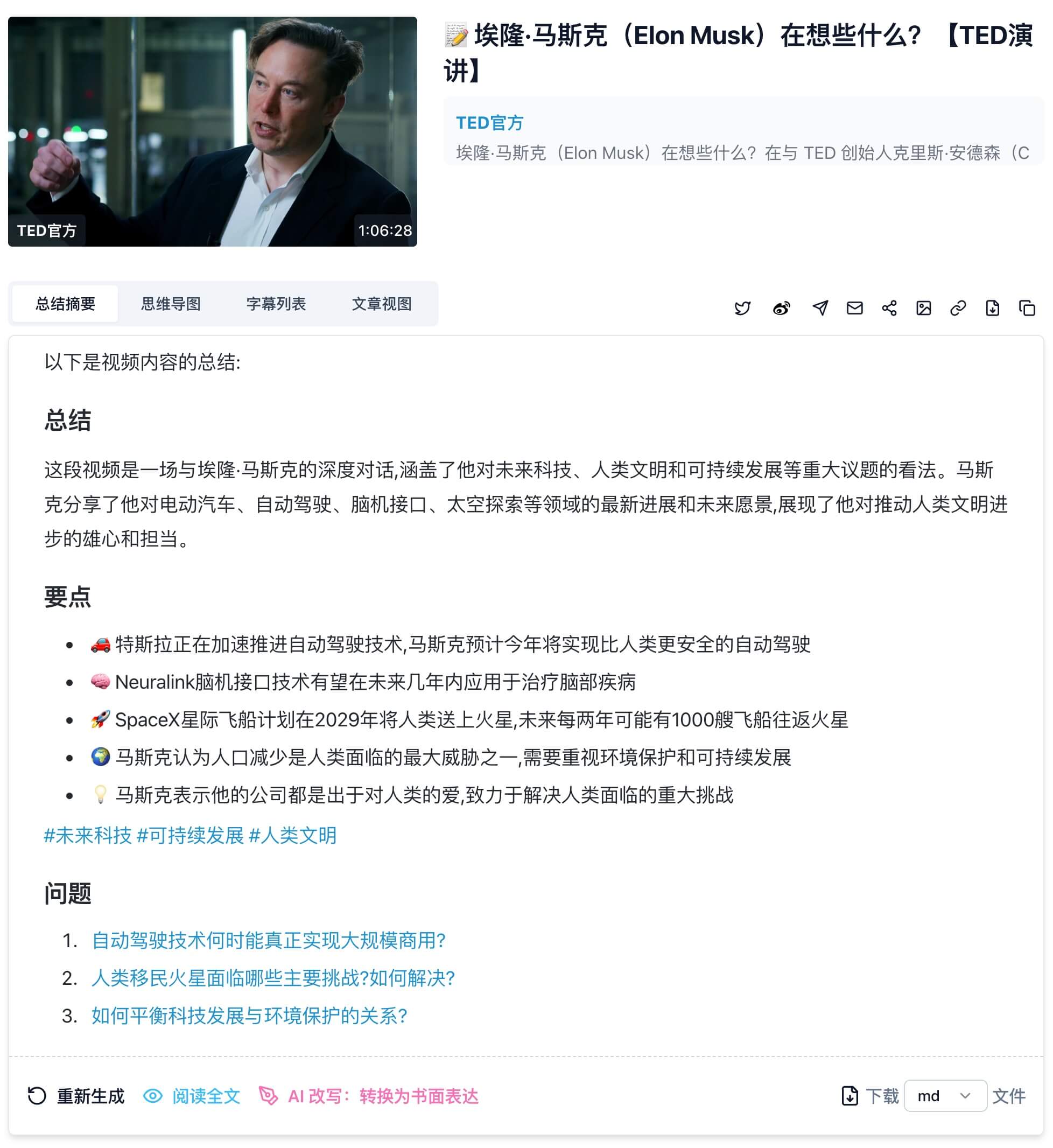 通过BibiGPT,用户不仅可以在高质量的音视频海洋中充分学习和探索,还能在丰富的信息中挖掘出更多有价值的见解。相信在不远的未来,AI总结技术将成为我们生活和工作的得力助手,帮助我们更高效地处理和利用信息。立即访问 BibiGPT 了解更多信息。