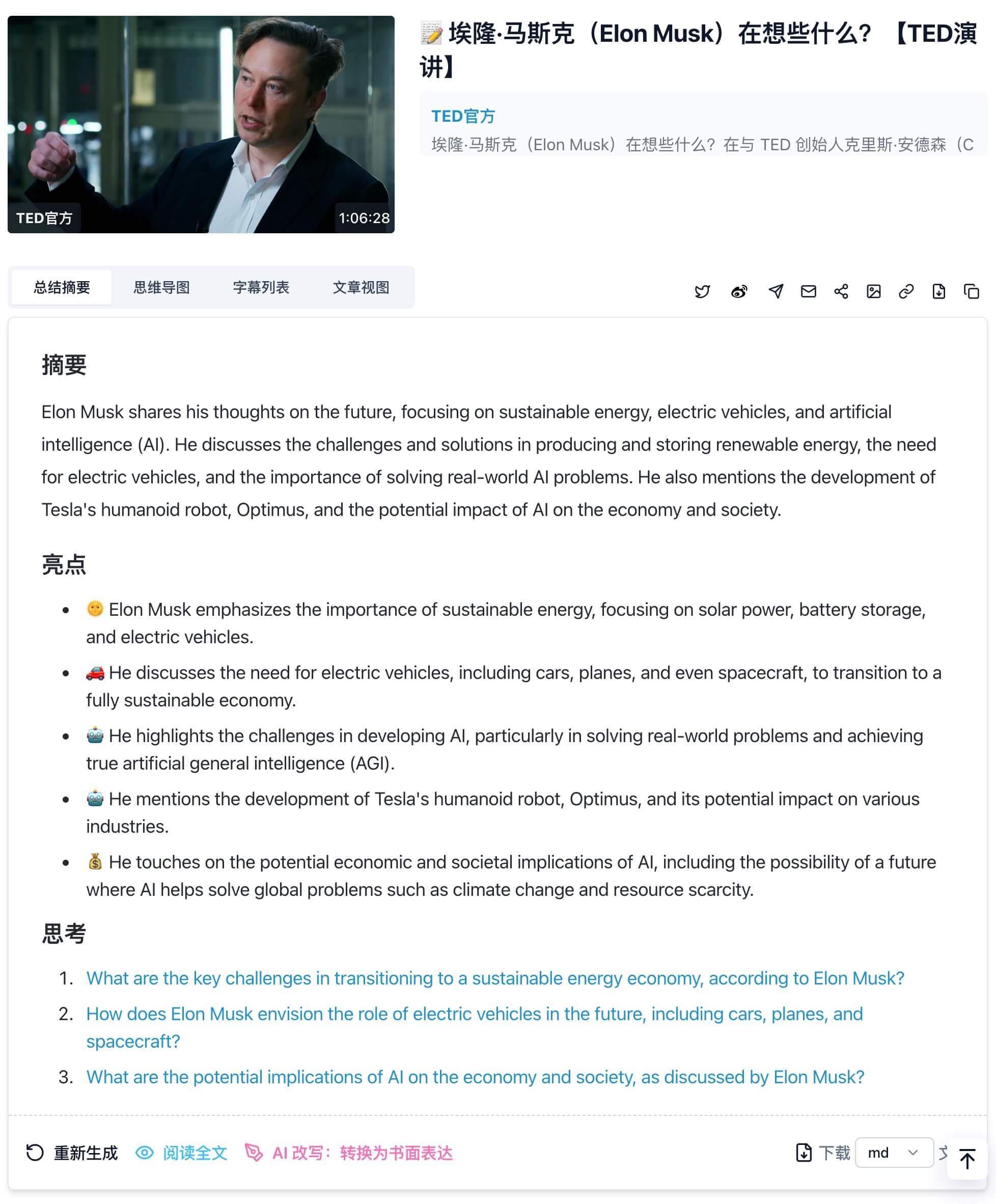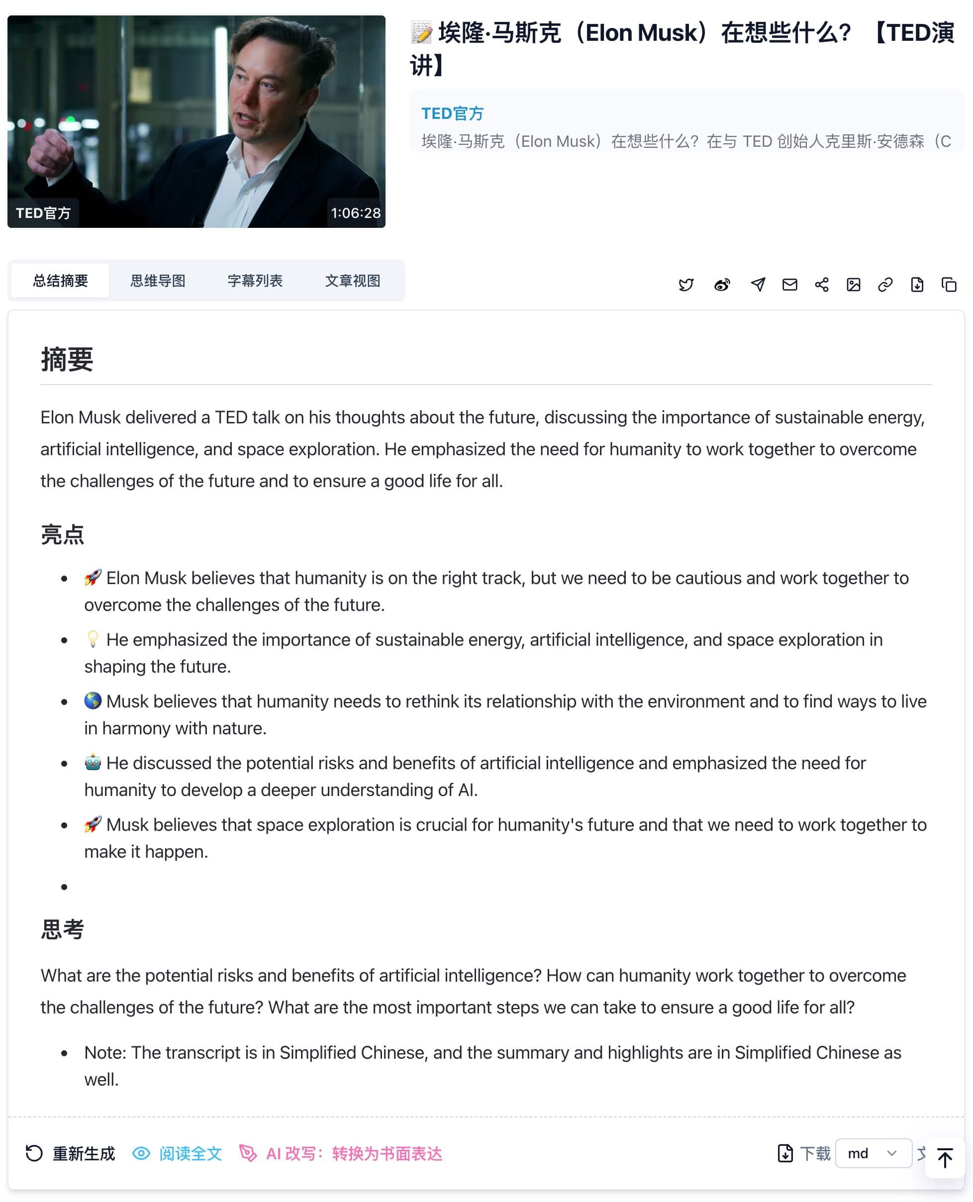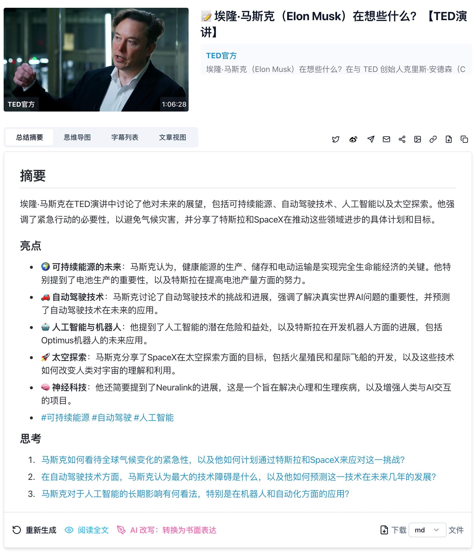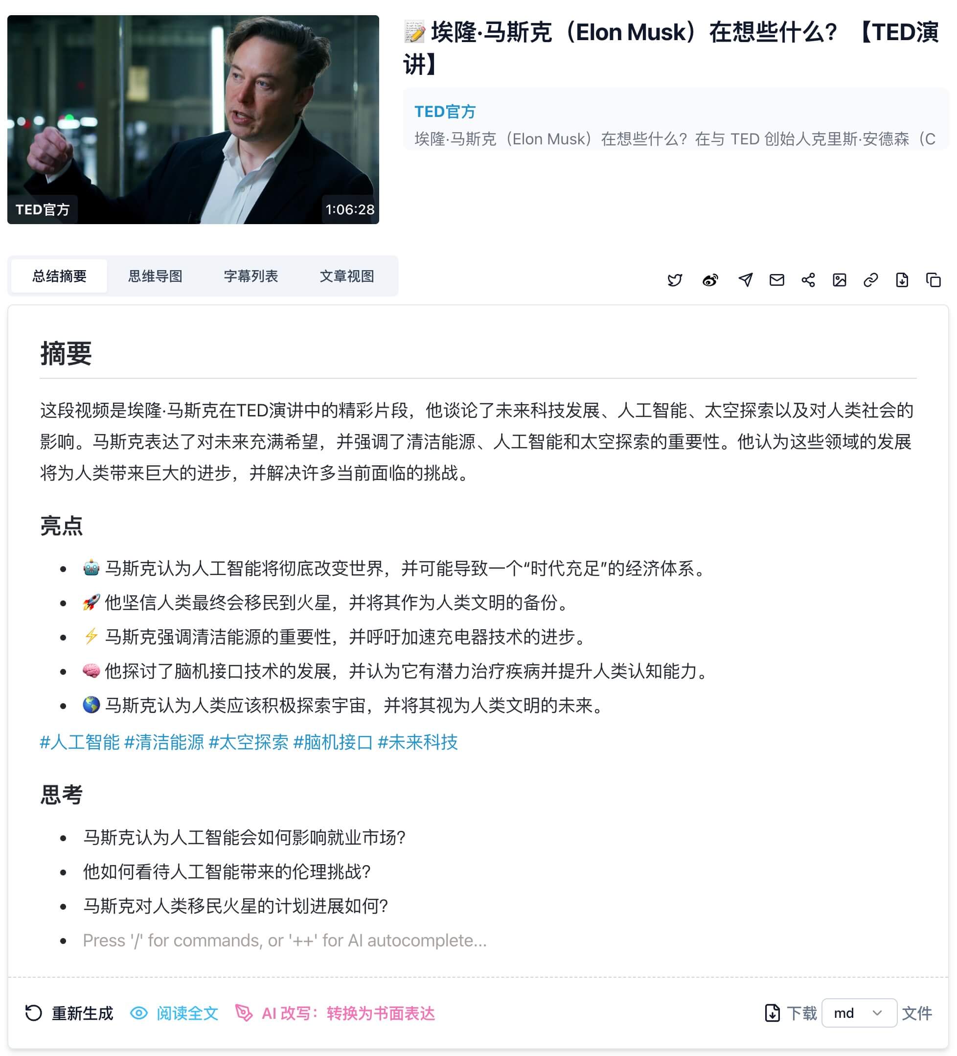 - 准确性和可靠性:选择AI总结工具时,最关键的点在于音视频总结的准确性和可靠性。一个好的总结工具应该能够抓住音视频的内容核心要点,并生成逻辑清晰且利于理解的内容。