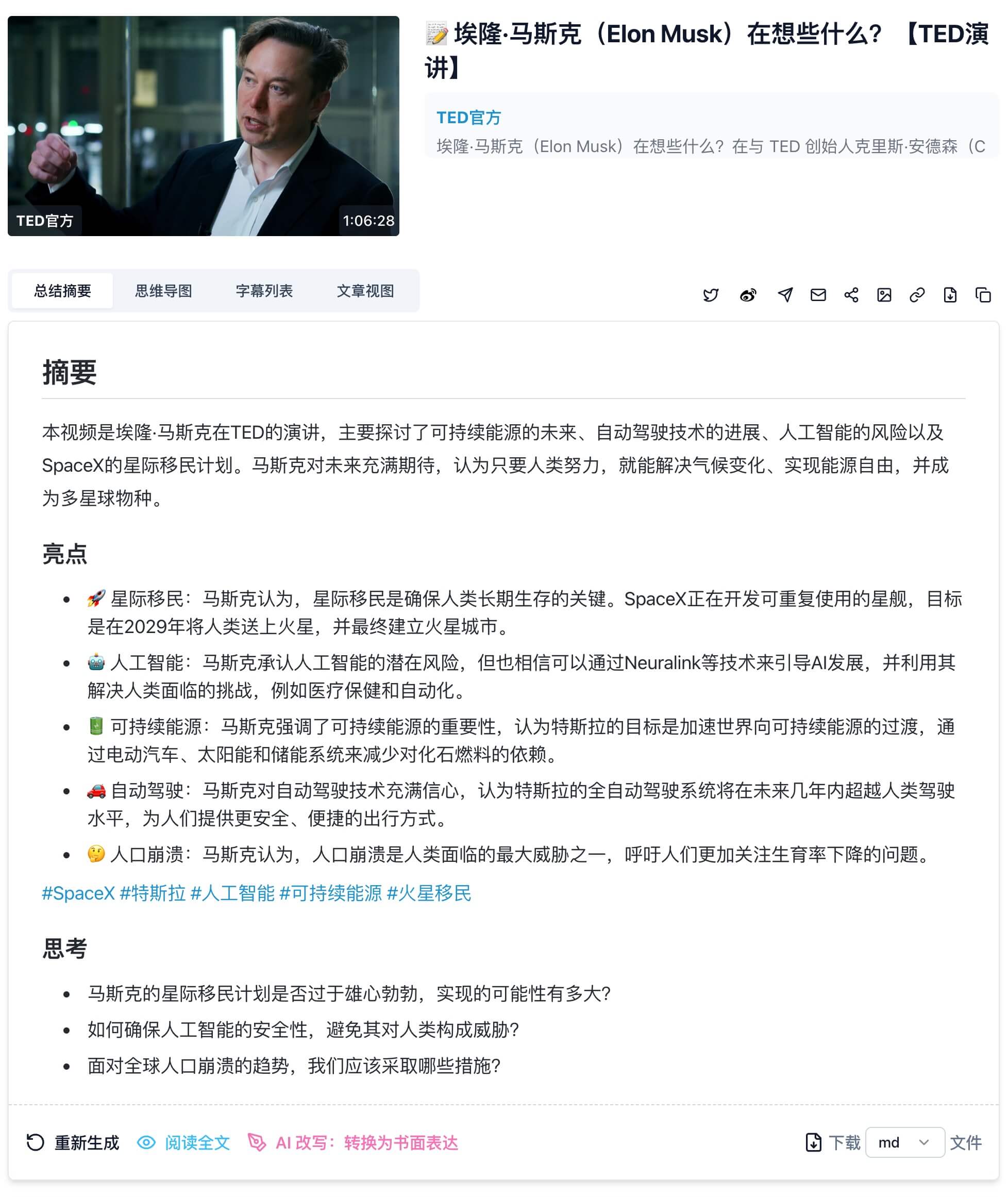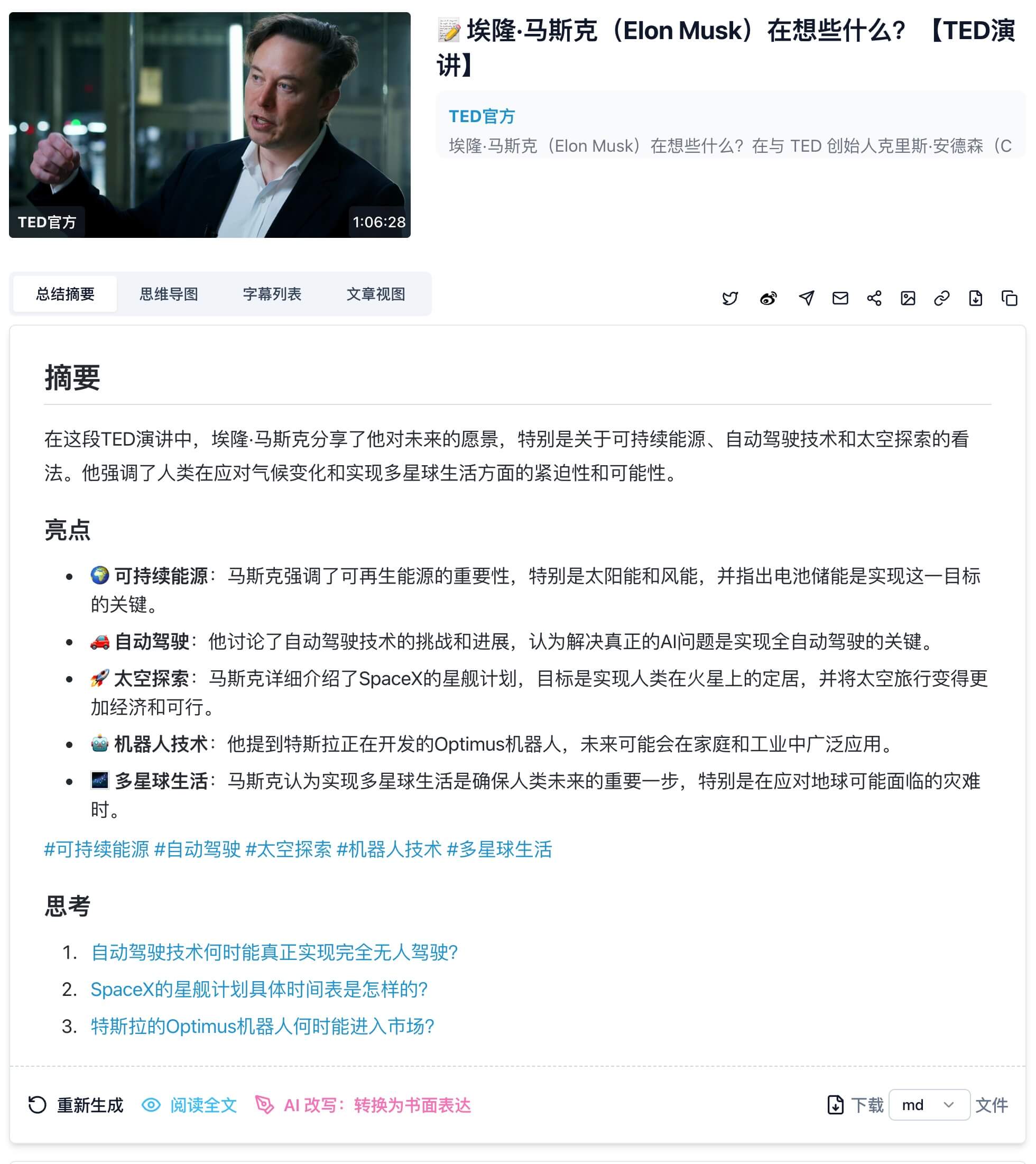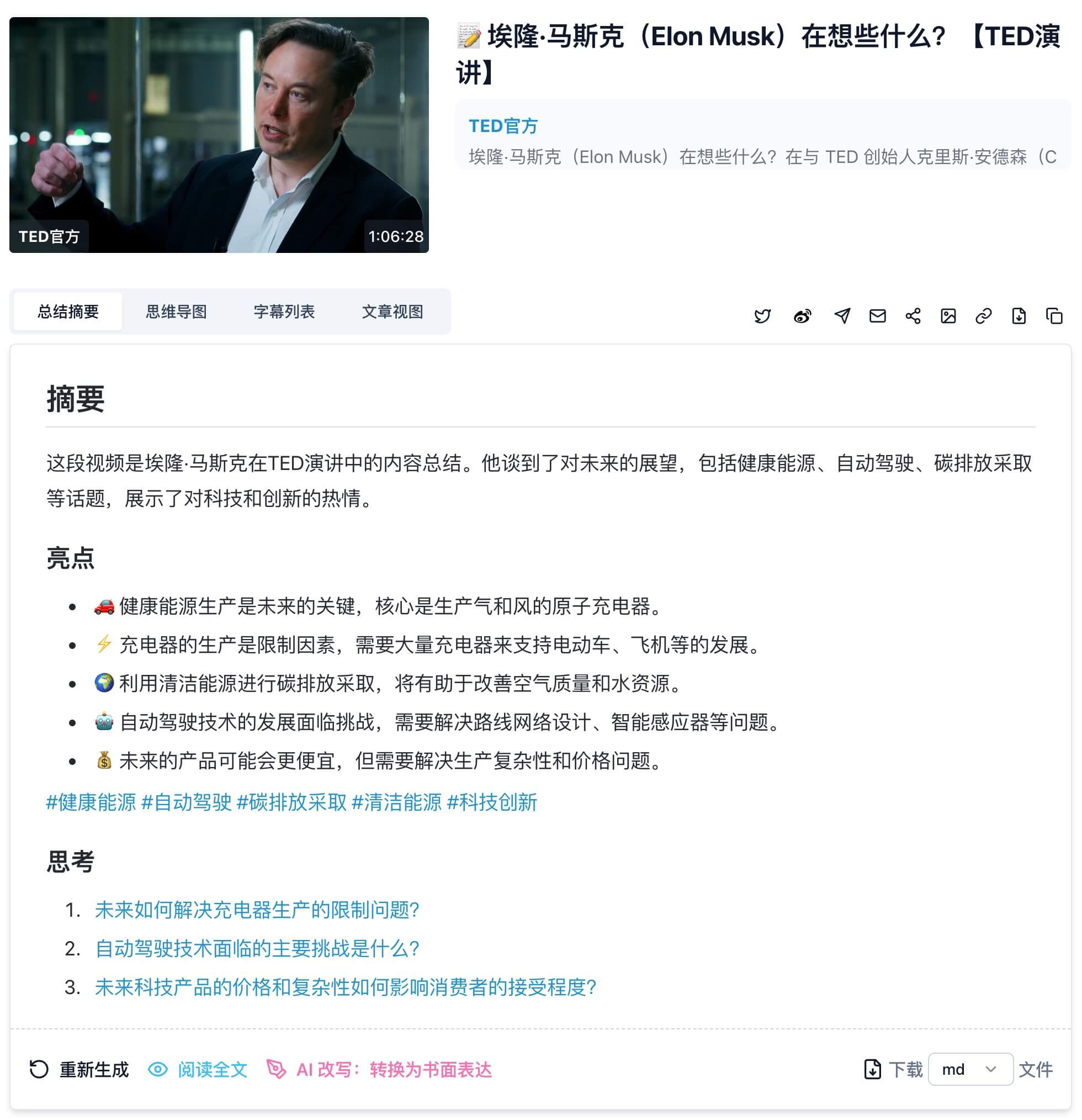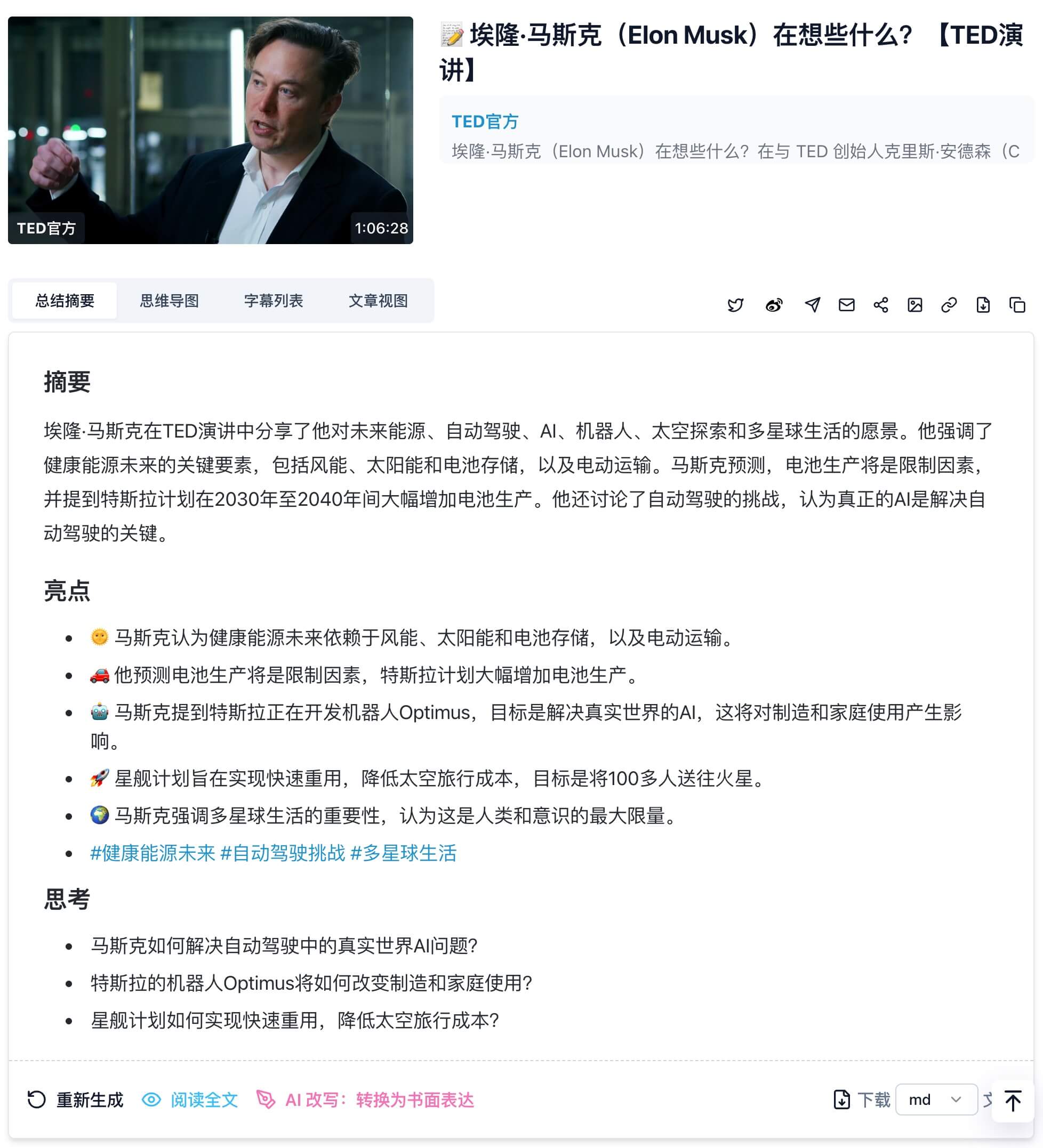 - 准确性和可靠性:选择AI总结工具时,最关键的点在于音视频总结的准确性和可靠性。一个好的总结工具应该能够抓住音视频的内容核心要点,并生成逻辑清晰且利于理解的内容。