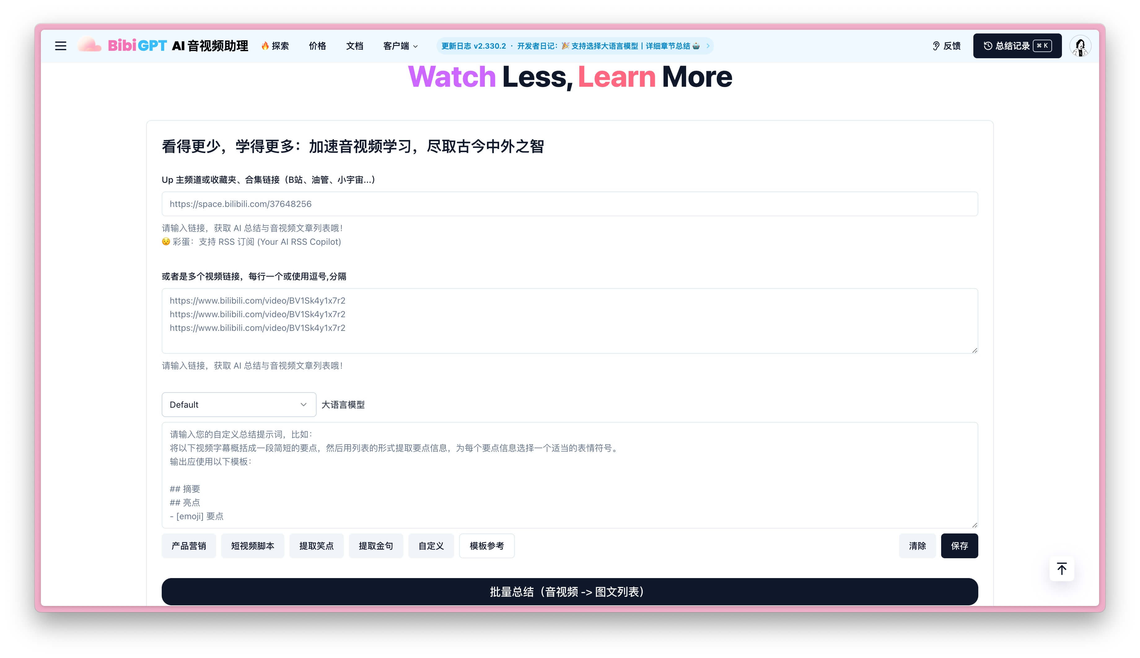 BibiGPT的批量音视频总结功能现已升级!您现在可以自定义Prompt并选择不同的大语言模型,让您的总结更加个性化和精准。