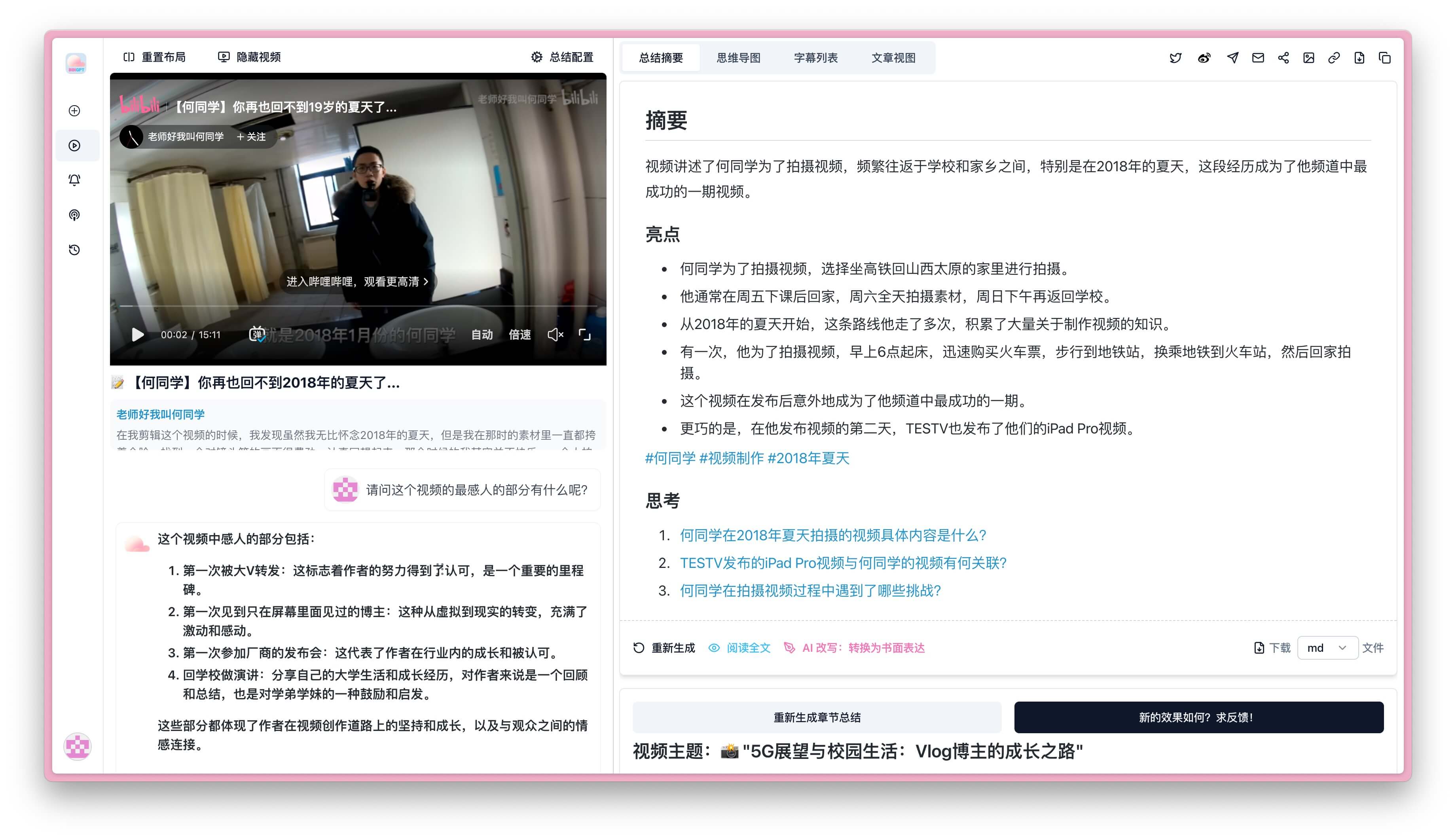- 集中管理:所有总结过的视频都汇聚在一个地方,方便用户快速找到所需内容。