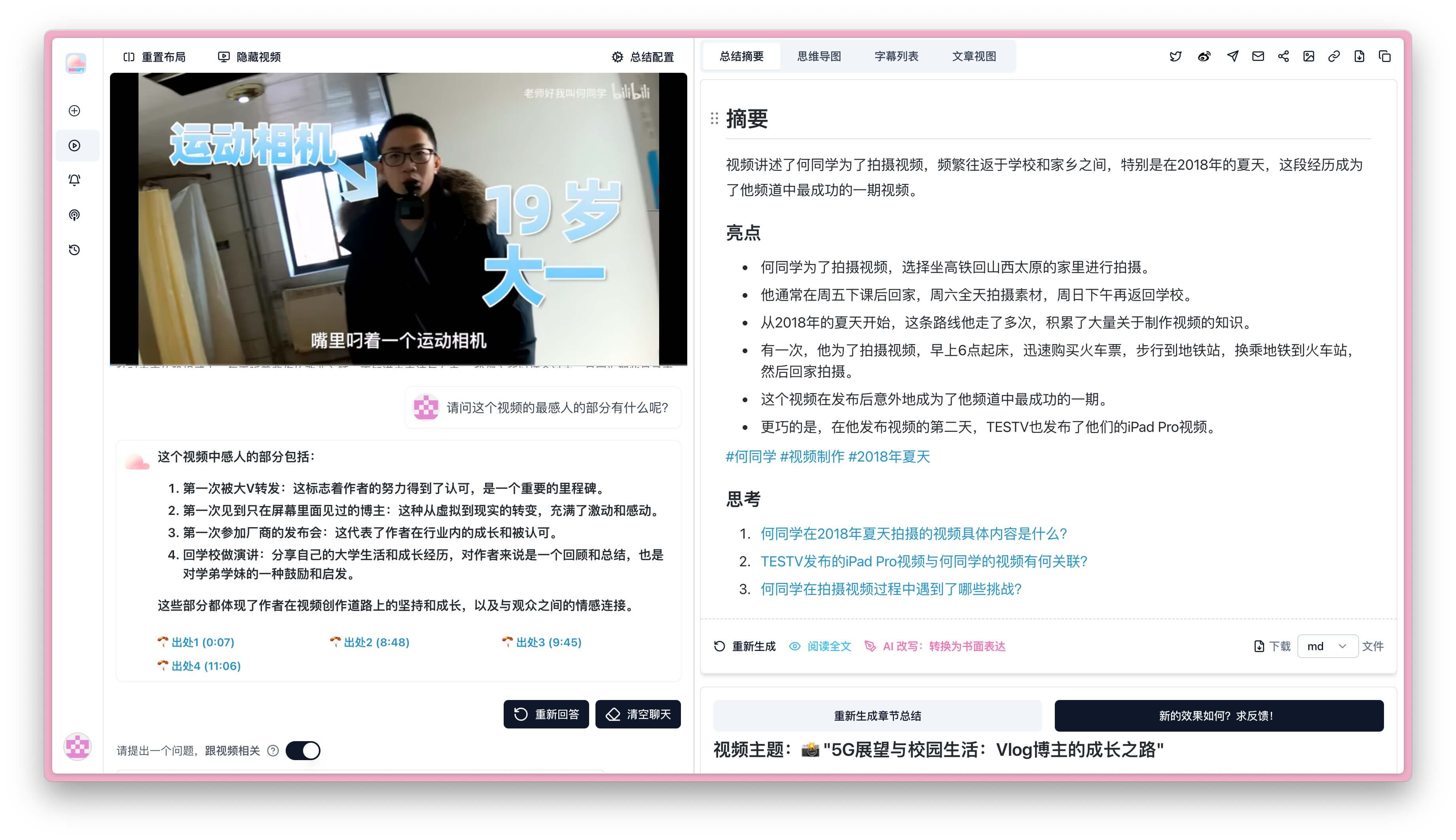 我们推出了全新的视频总结界面,让您在使用BibiGPT时更加便捷。 界面分为左右两个区域:左侧为视频和问答区域,右侧为视频总结区域,方便您快速获取关键信息。