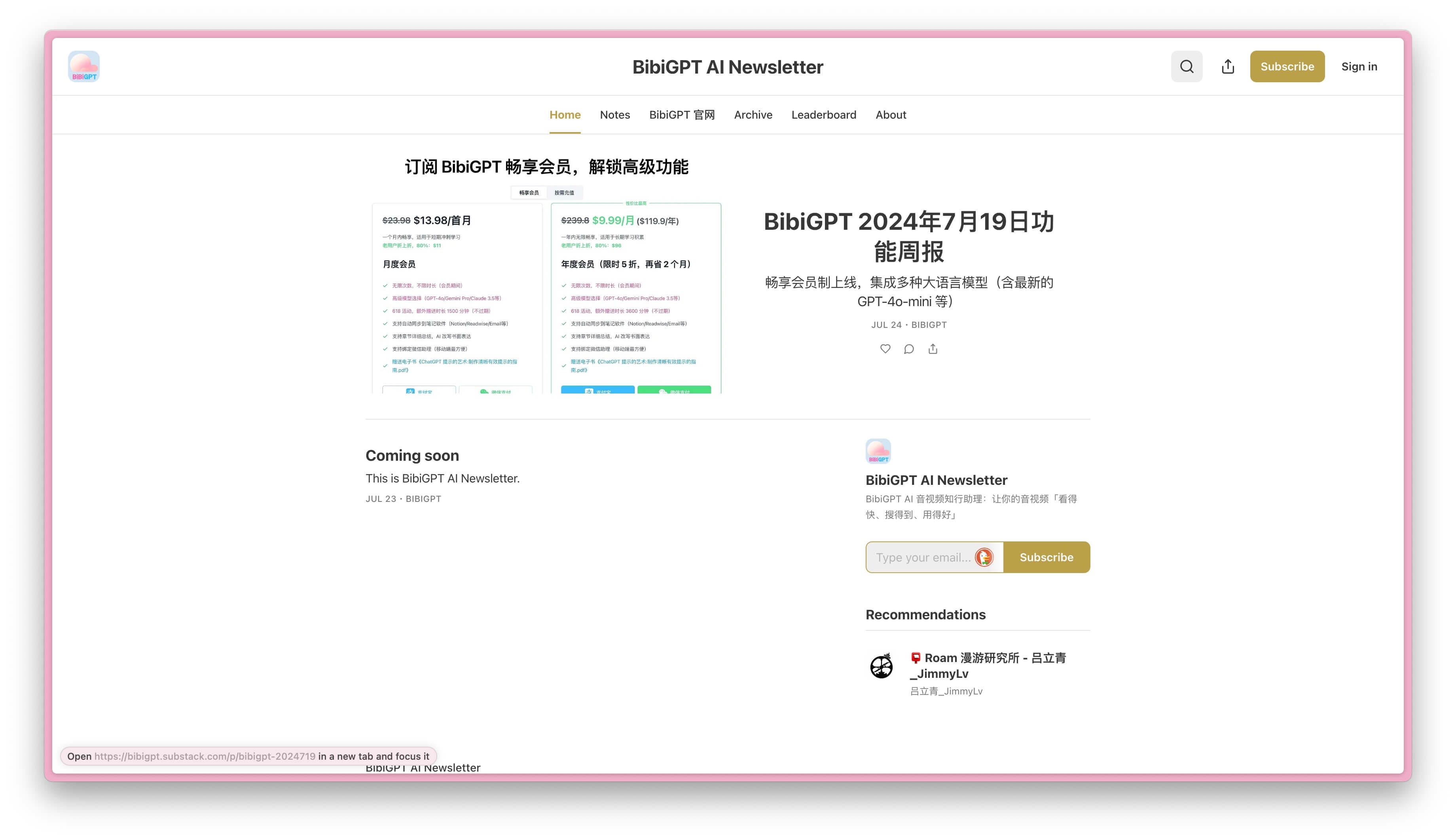 BibiGPT现已通过Substack为用户提供功能更新的Newsletter,带来更便捷的信息获取体验!