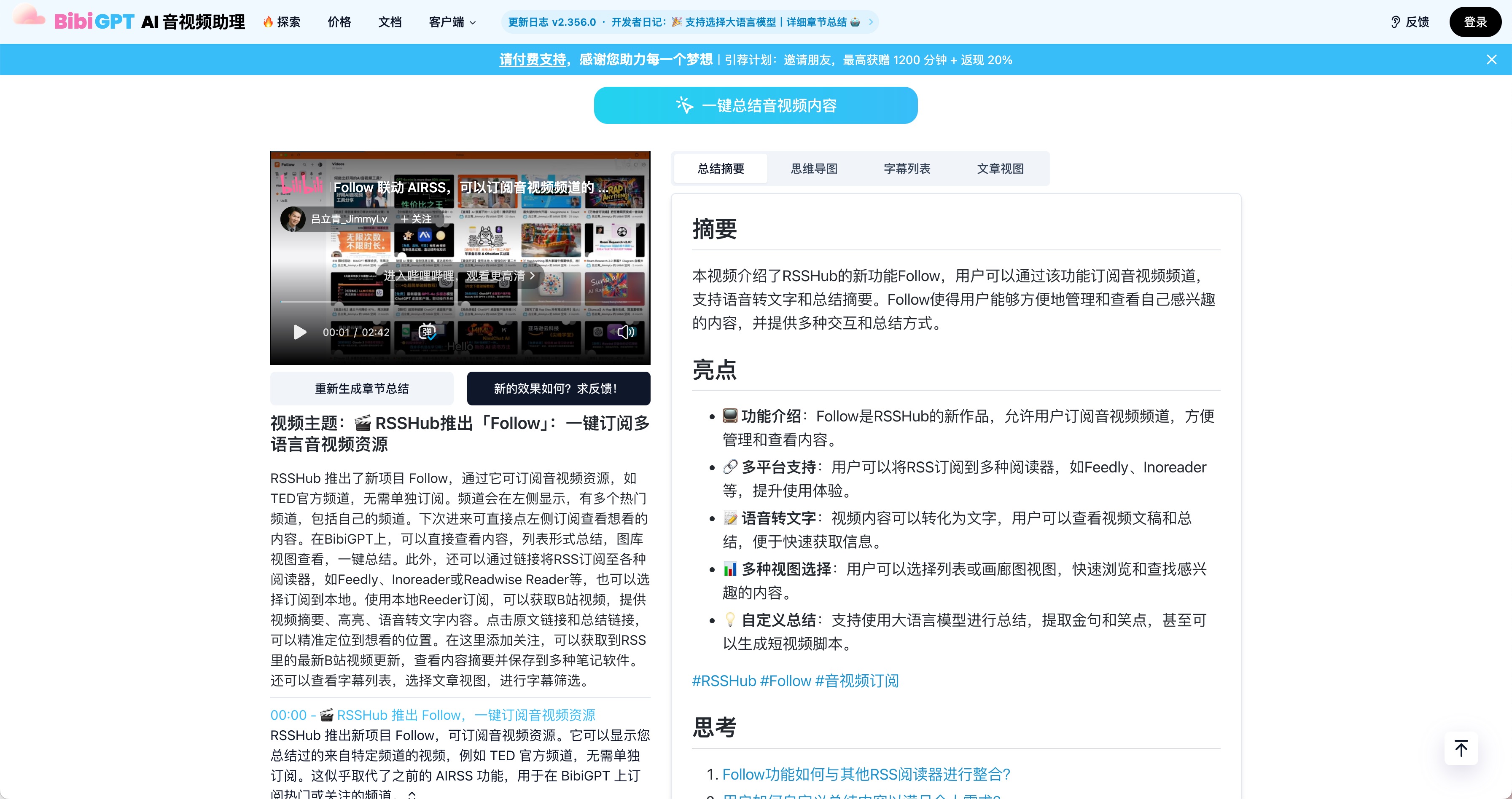 BibiGPT重大更新:字幕优化、章节总结升级、思维导图增强 | 2024年8月16日产品迭代报告