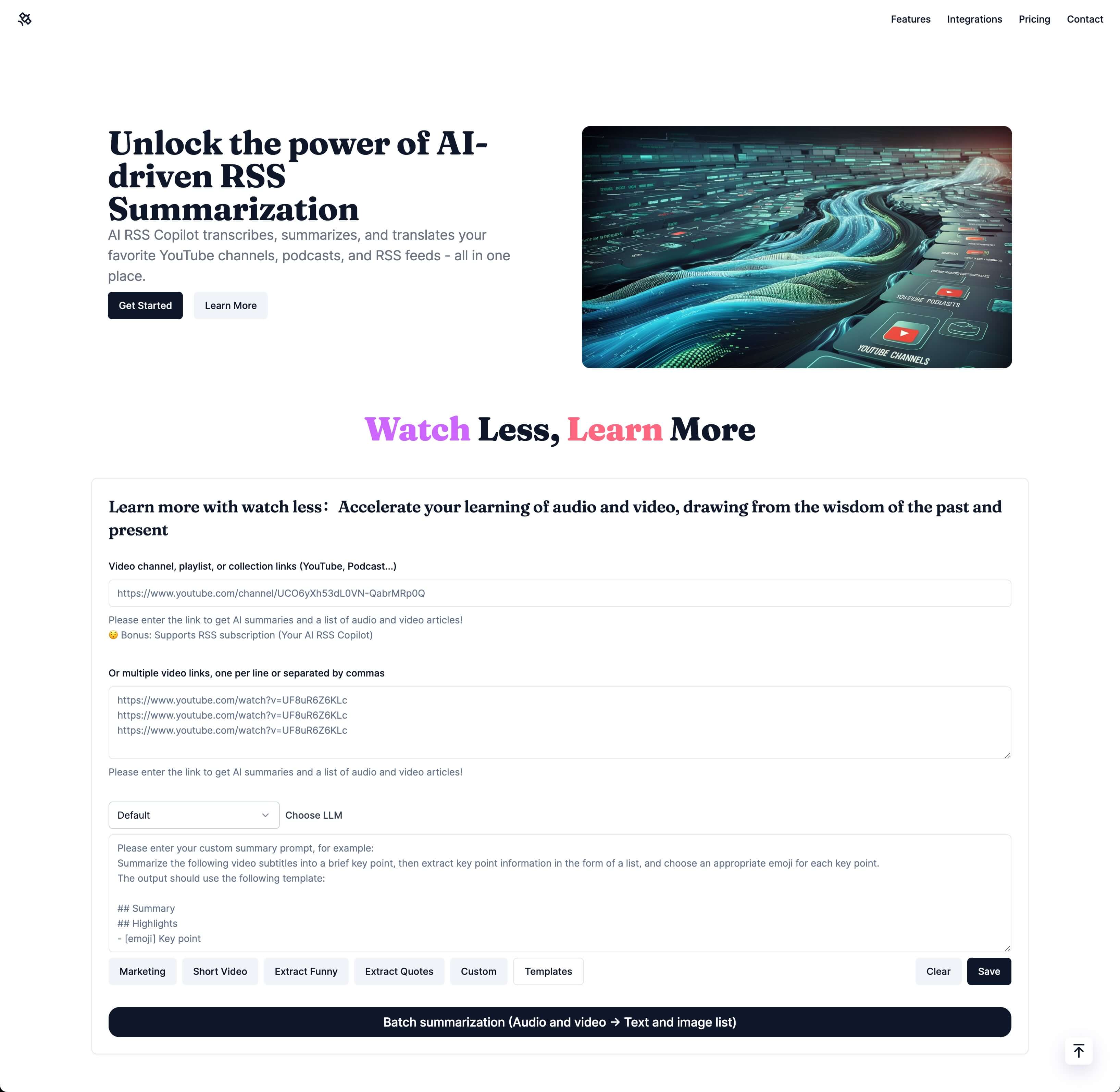 我们推出了全新的Landing Page,提升了用户体验,访问请前往 airss.co。AIRSS现在可以帮助您解锁AI驱动的RSS摘要功能,轻松转录、总结和翻译您喜爱的YouTube频道、播客和RSS源,尽在一处。新增功能支持直接生成YouTube和B站频道的RSS订阅链接,例如: airss.co/https://www.youtube.com/@mreflow。这个更新让您可以更快地获取音视频内容,节省时间,提升效率!