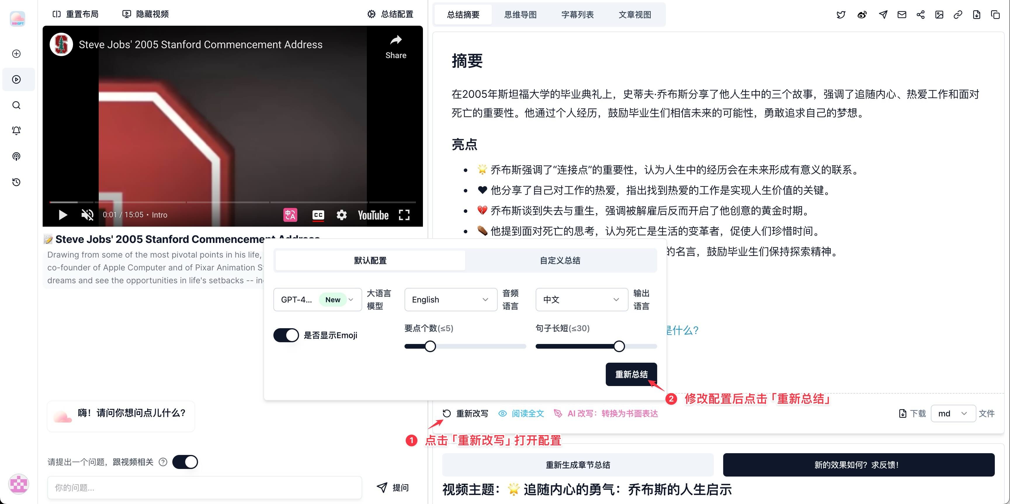 我们在视频总结区域下方新增了「重新改写」按钮,用户可以轻松选择不同的总结配置。重新改写功能支持「默认配置」和「自定义总结」的重新配置,满足您的特定需求。这个功能让音视频内容的总结更加灵活和个性化,使用起来更方便。