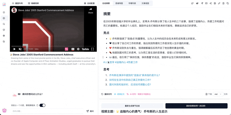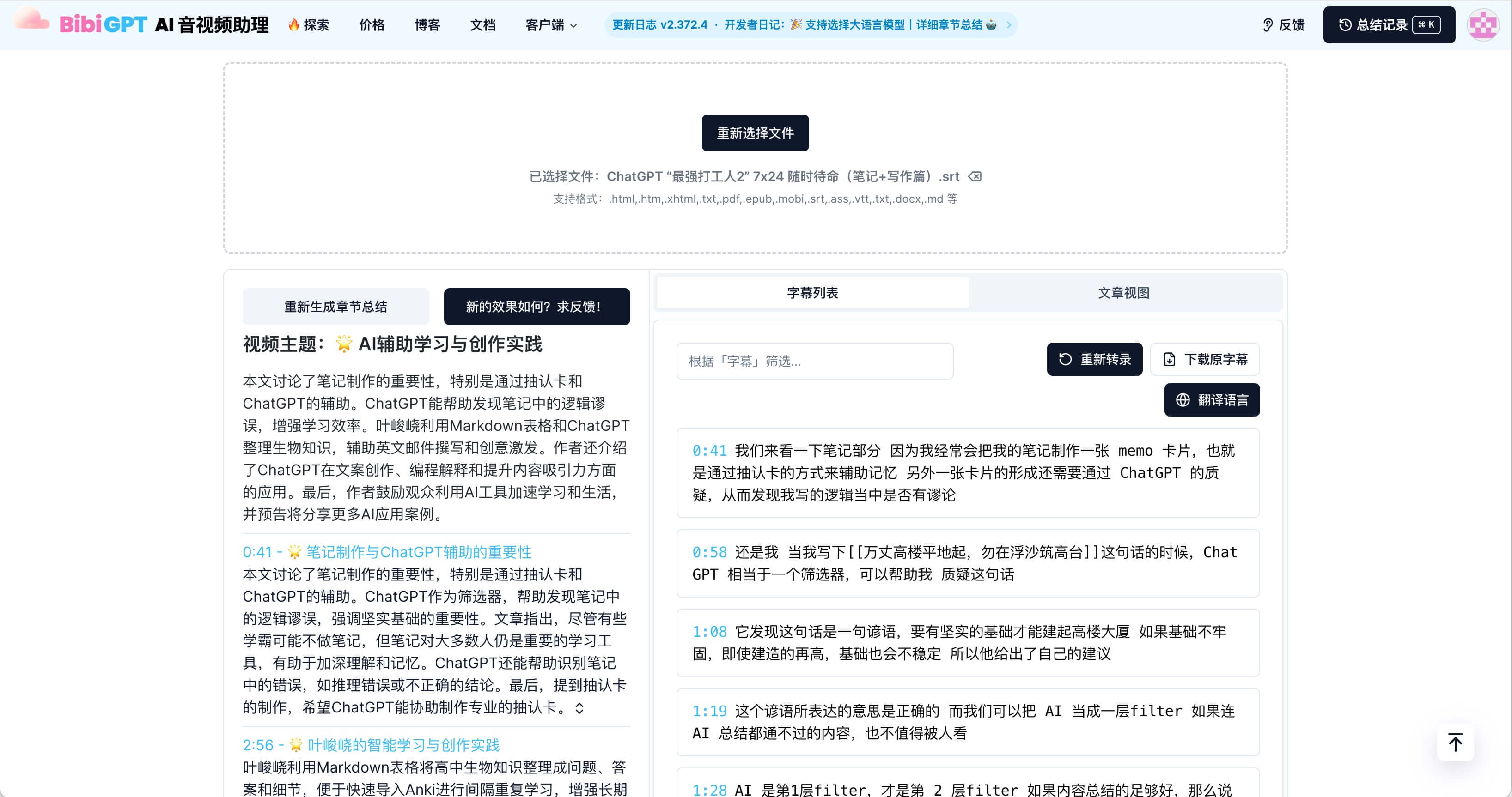 本周BibiGPT推出多项新功能,包括支持上传字幕文件总结、全新AIRSS首页、内置视频搜索能力、重新生成总结功能等,全面提升用户体验。