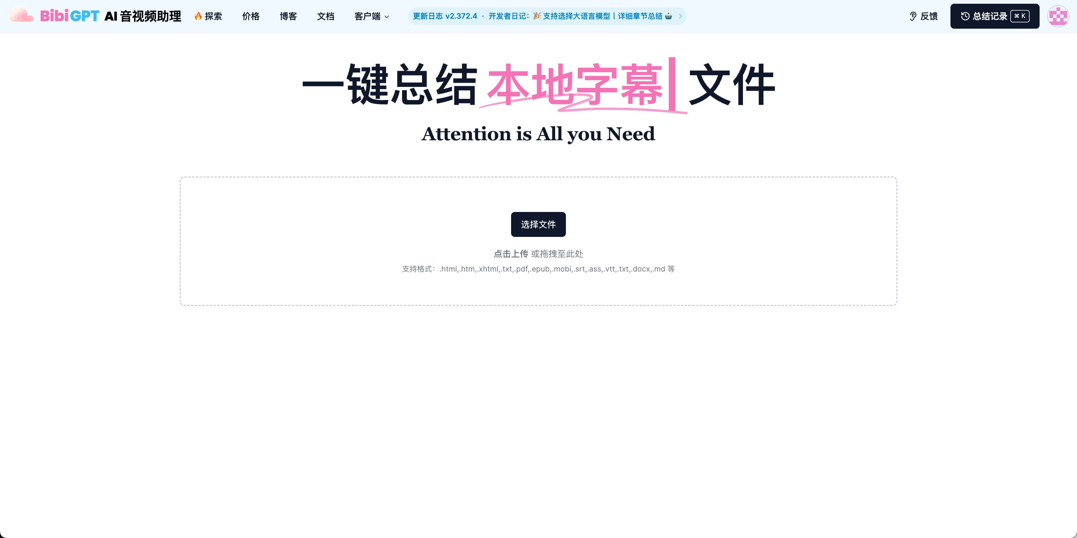 我们为BibiGPT新增了一个独立功能页面,用户现在可以轻松上传字幕文本文件进行总结,支持 .srt 和 .vtt 字幕格式。您可以通过访问 bibigpt.co/srt 直接使用此功能。适用场景包括已有转录好的字幕文本,或者通过剪映等工具生成的字幕,用户可以在此进行快速总结。未来我们还将支持更多文本格式,如 .txt、.pdf 和 .md,进一步提升使用灵活性。