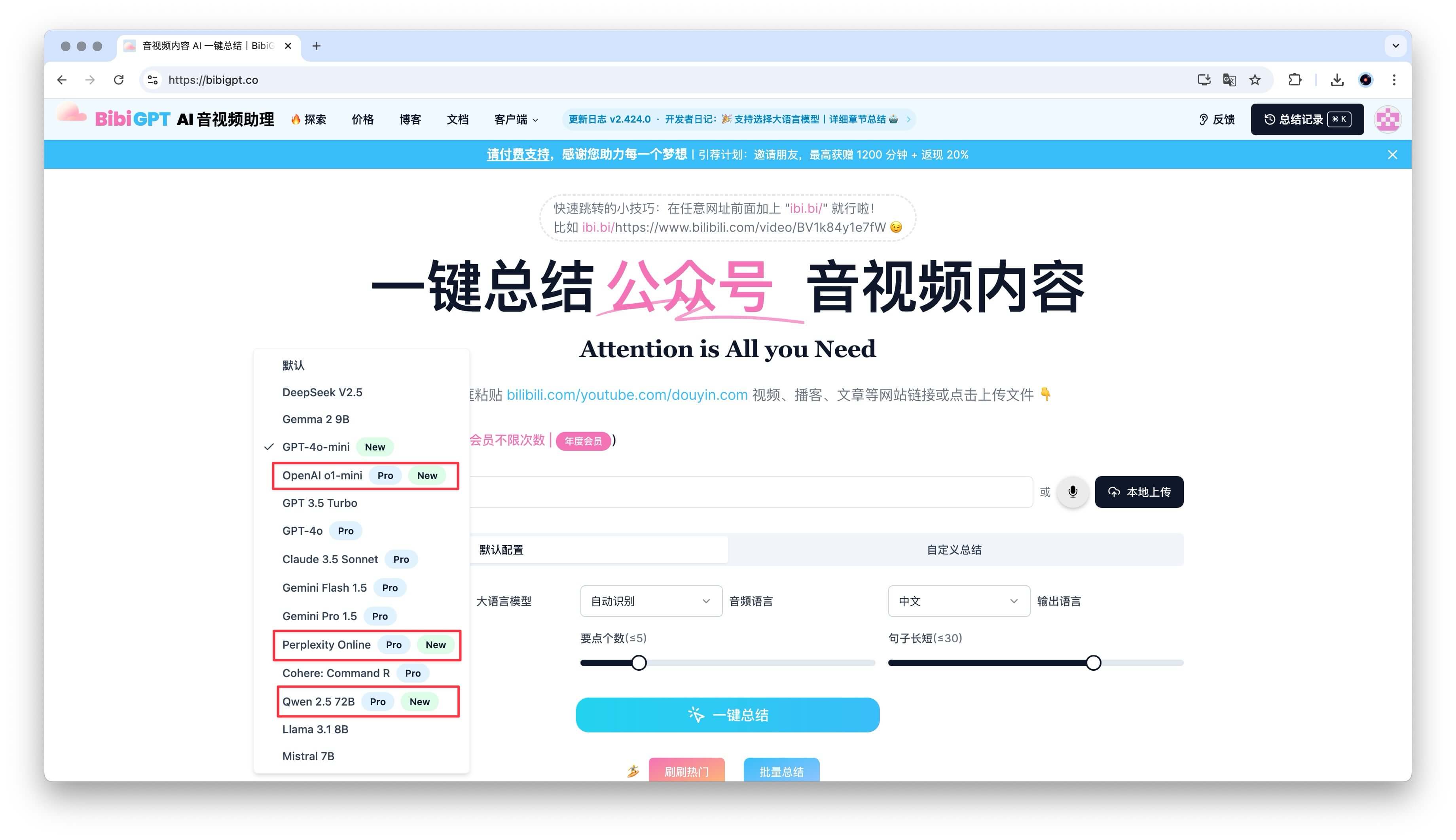 - 支持全新的 OpenAI o1-mini 模型,提升了音视频总结的准确性和效率。 - 引入 Perplexity 联网模型,增强了对复杂内容的理解能力。