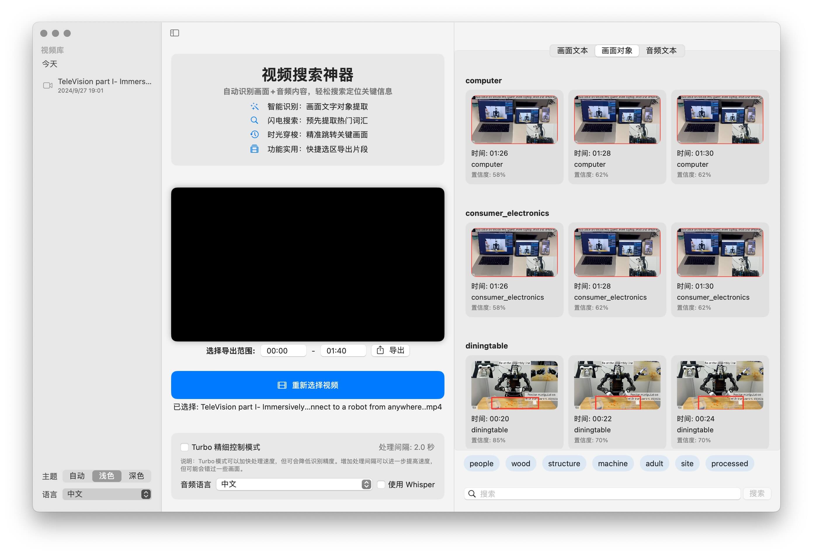 - 推出纯原生的macOS视频搜索应用,极大提升了用户体验。 - 支持搜索画面中的文本、对象以及语音文本,让查找信息变得更加迅速便捷。 - 在App Store直接搜索VideoSearch即可下载安装,方便快捷。