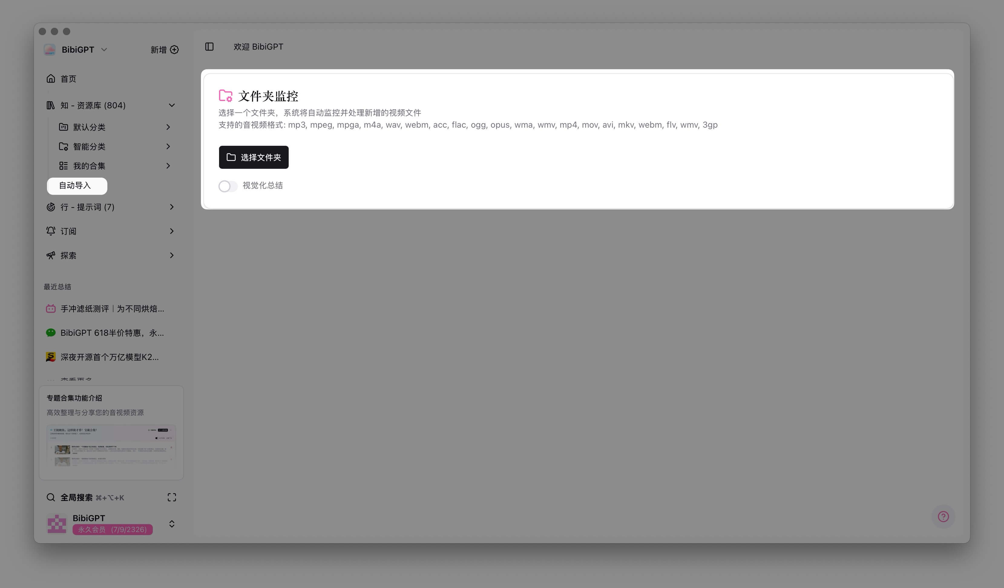 - 本地文件夹监控:设定您常用的文件夹,BibiGPT会自动发现新增的音视频文件,并提醒您一键进行处理,实现自动化工作流。