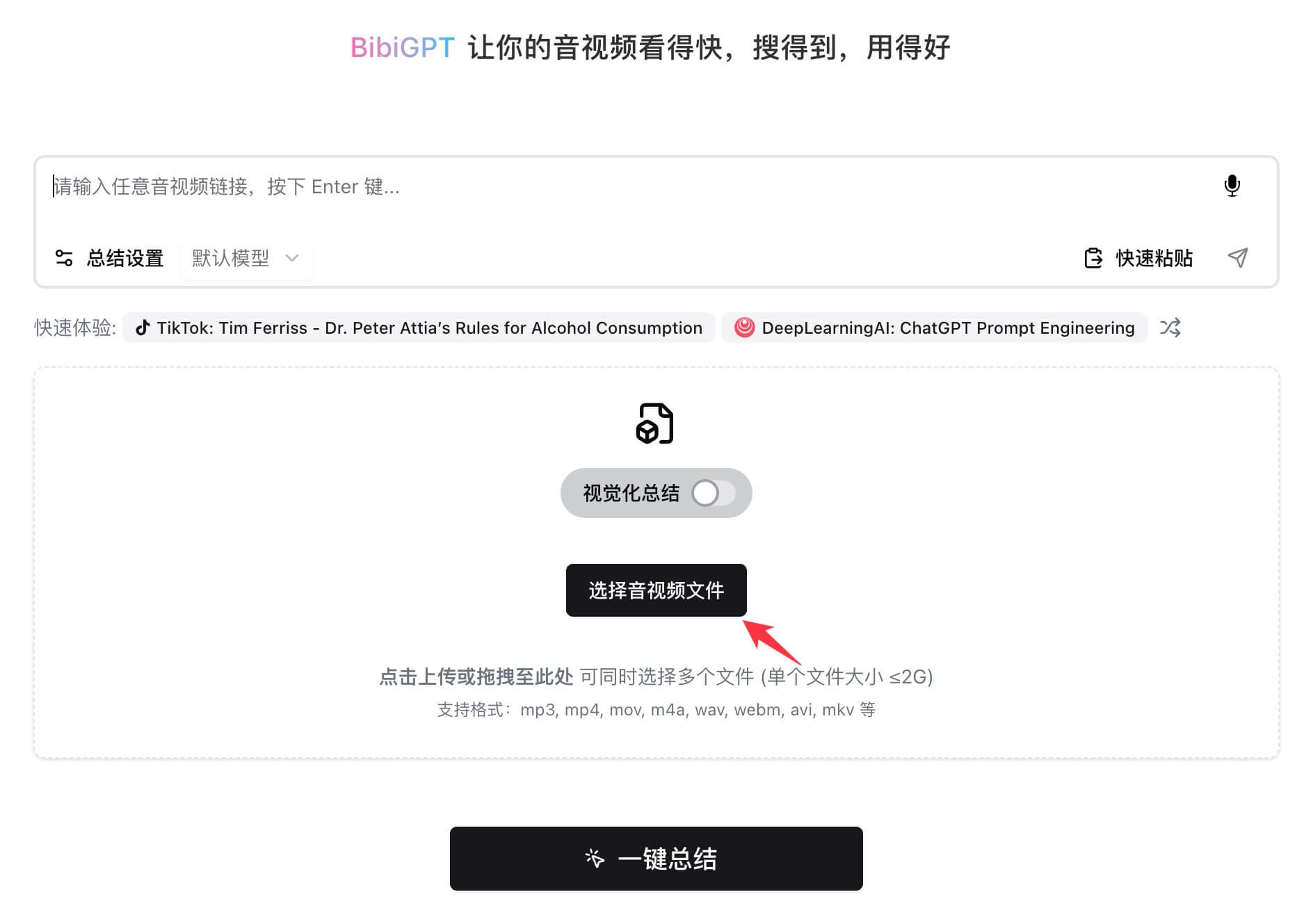 - 选择本地上传:在 BibiGPT 中找到选择音视频文件。