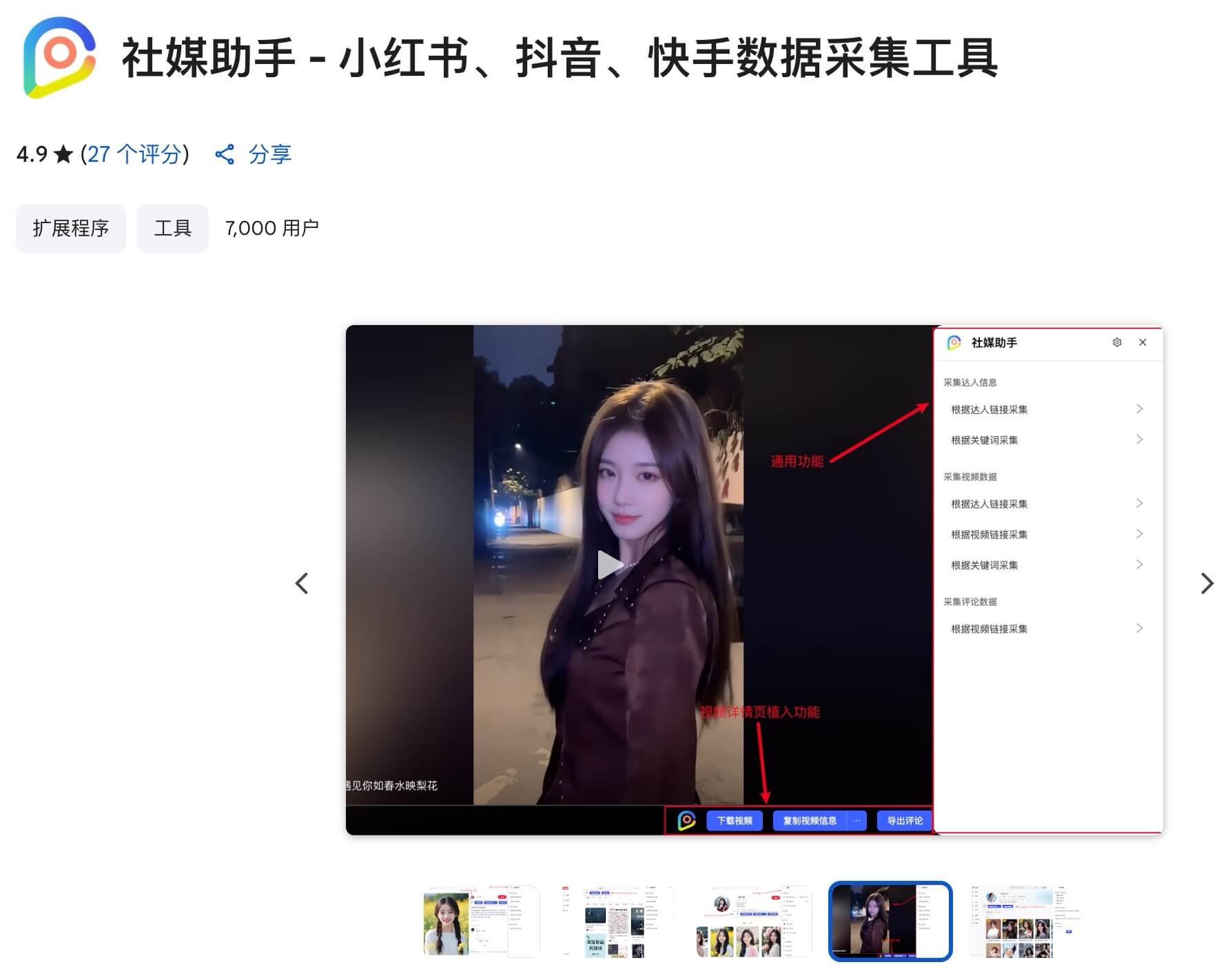 - 获取方式:Chrome应用商店直达链接:社媒助手 - 小红书、抖音、快手数据采集工具