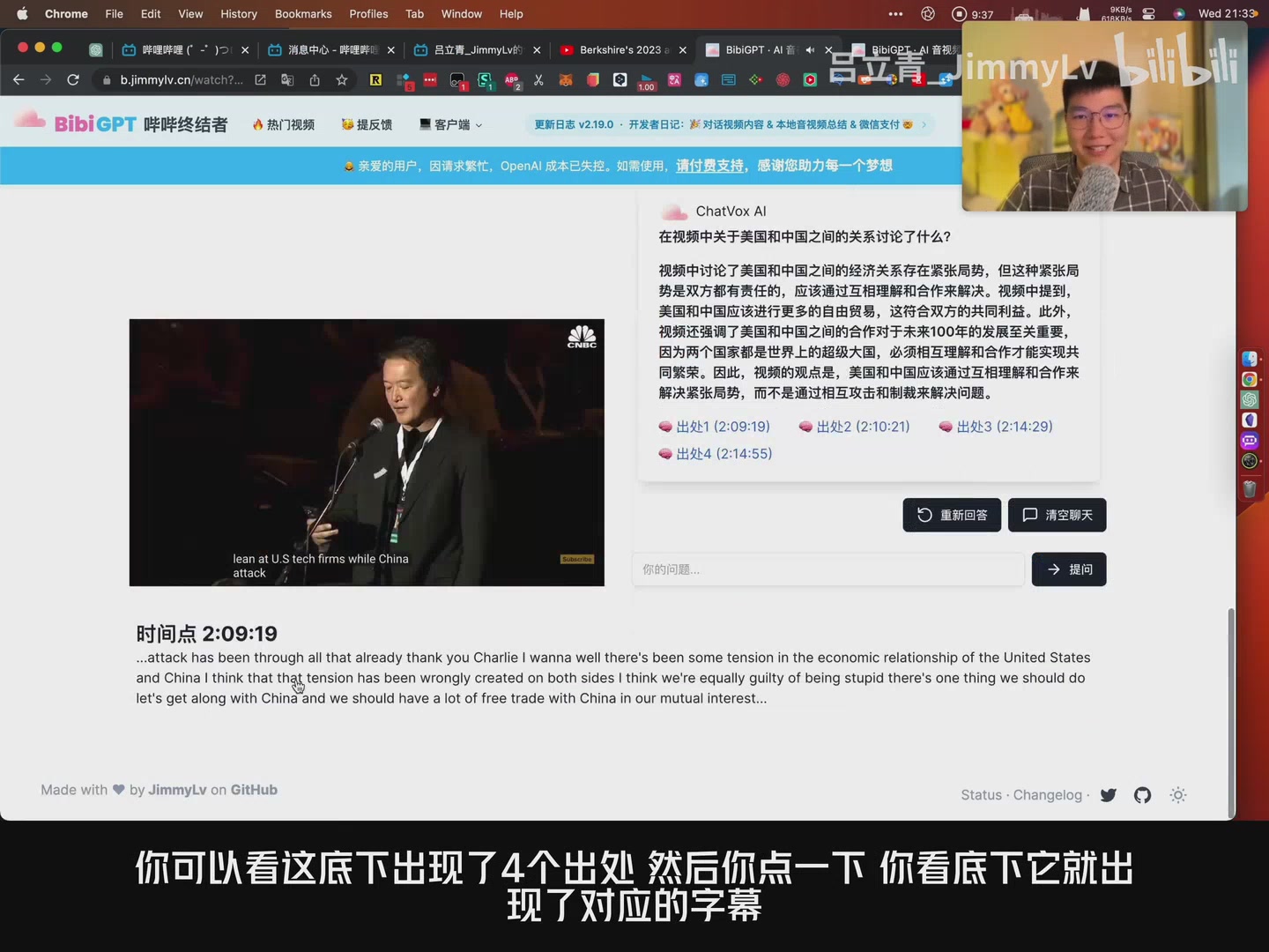 以巴菲特股东大会视频为例,点击"开启对话"后,你就可以像和聊天机器人对话一样,向这个视频提问了。比如,视频中提到了对中美关系的看法,我们可以直接问:"视频中对中美关系的看法?"