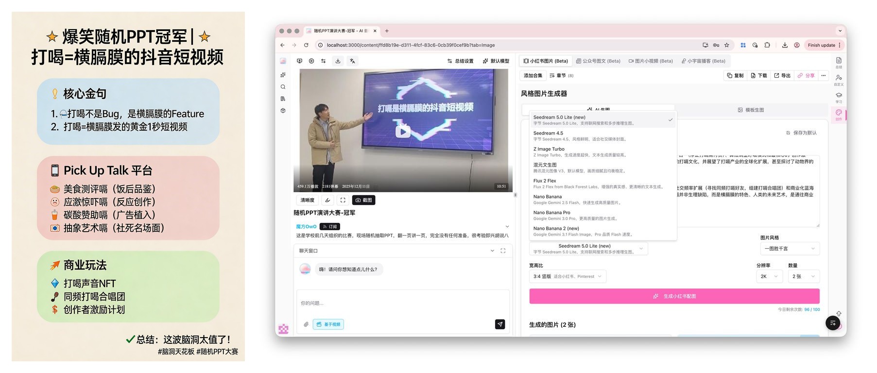 BibiGPT 的「小红书图片」功能又有了新面孔。我们新增了 Seedream 5.0 Lite (new) 和 Nano Banana 2 (new) 两款图片生成新模型。Seedream 5.0 Lite 支持联网搜索和多步推理,能帮你生成逻辑更清晰、画质更精细的配图;Nano Banana 2 基于 Google Gemini 3.1 Flash Image 技术,它更注重图片细节和生成速度。我们希望这些新模型能帮你把视频内容变成更吸睛的小红书笔记。